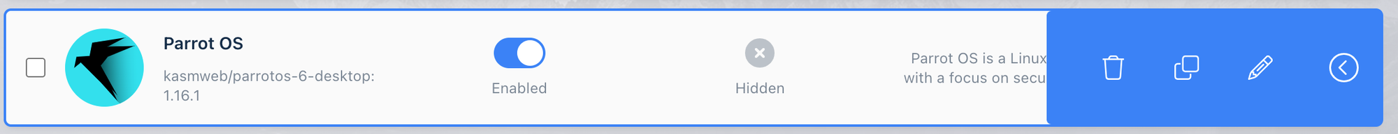 ghcr.io/bubuntux/nordvpnNow if you go back to your Kasm Workspace Admin tab and hit Workspaces, click the arrow on the right hand side of you Parrot box.