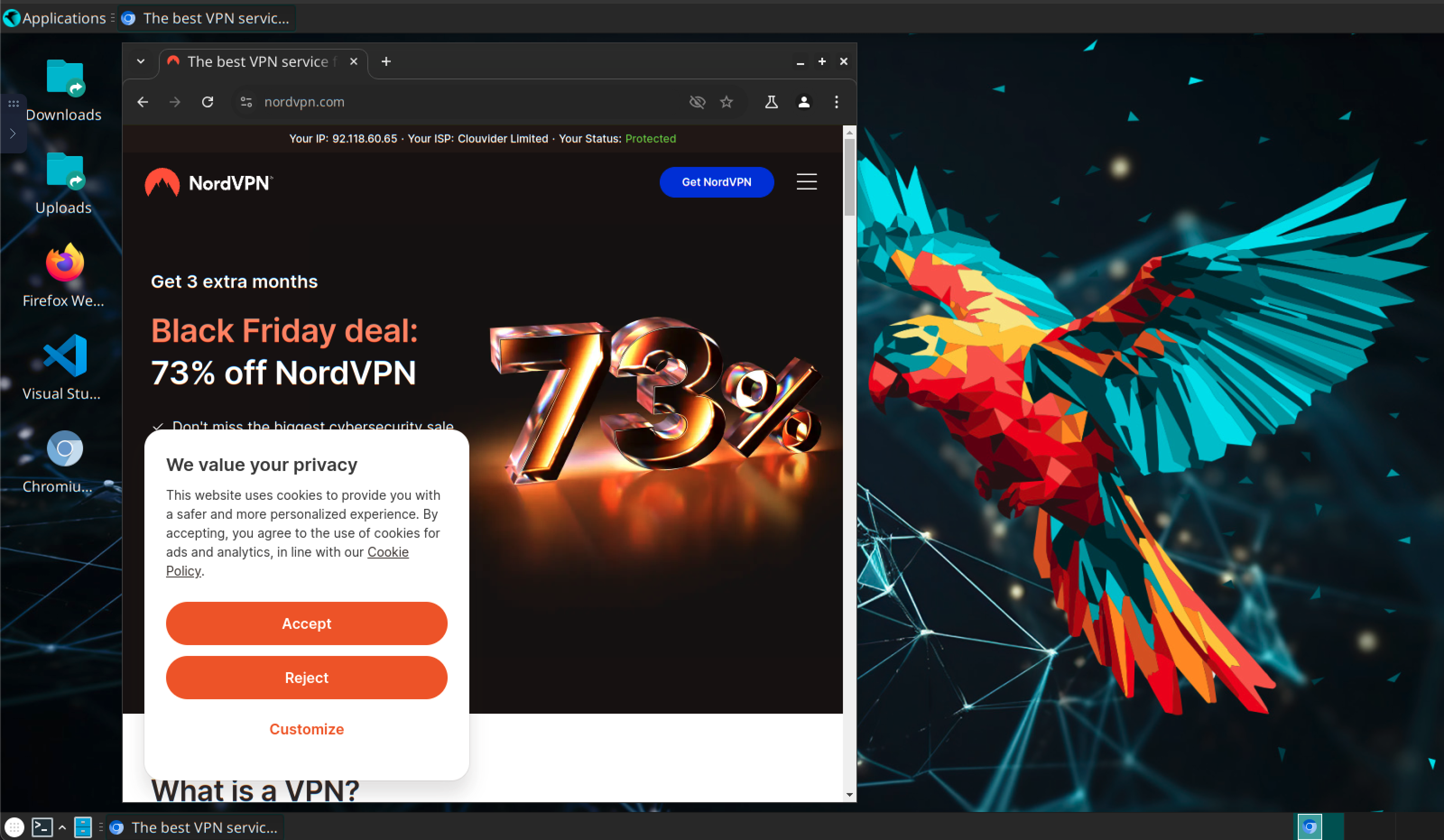 Now if you go back to the Workspaces tab at the top and launch your Parrot instance again everything should load as per normal with one small difference. Launch Chromium (note: you can do this now you're using Parrot. I'm still unsure why the Kasm Kali box doesn't let you) and go to the NordVPN website. You should see at the top of the screen that your IP is registered as 'Protected'.