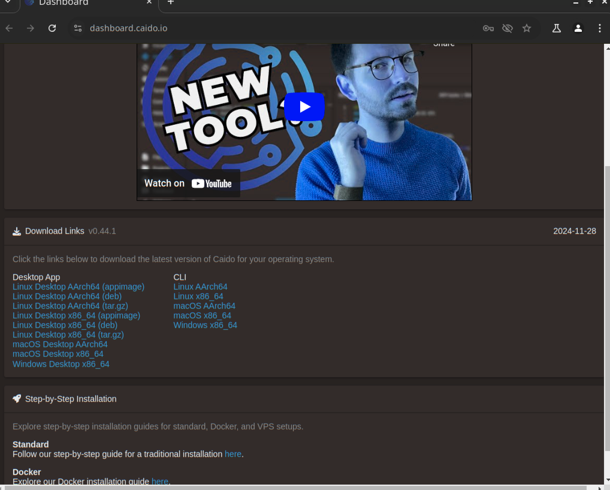 Now for installing Caido. Caido is essentially an alternative to Burpsuite, but I've found that it get's blocked by services like Cloudflare far less regularly. There's a few other benefits too but I'll leave that up to the reader to go down the rabbit hole on that. For now, just go to the Caido website and register an account here .